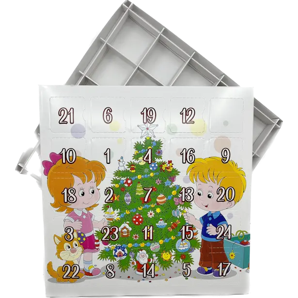Adventní kalendář "Děti u stromečku" s papírovou vložkou 28x28x2 cmna objednávku 325 ks85 Kč/ ks70 Kč bez DPH