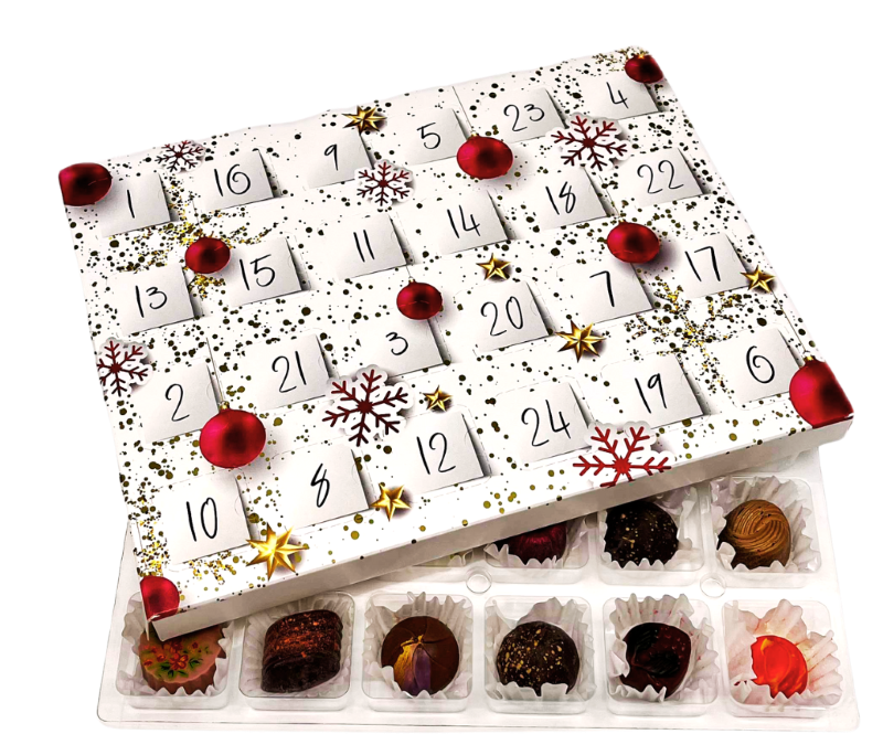 Elegantní a slavnostní adventní krabička s designem červených ozdob, zlatých hvězd a vloček. Kalendář je vybaven plastovým blistrem se 24 políčky pro uložení pralinek, mini perníčků nebo drobných překvapení.