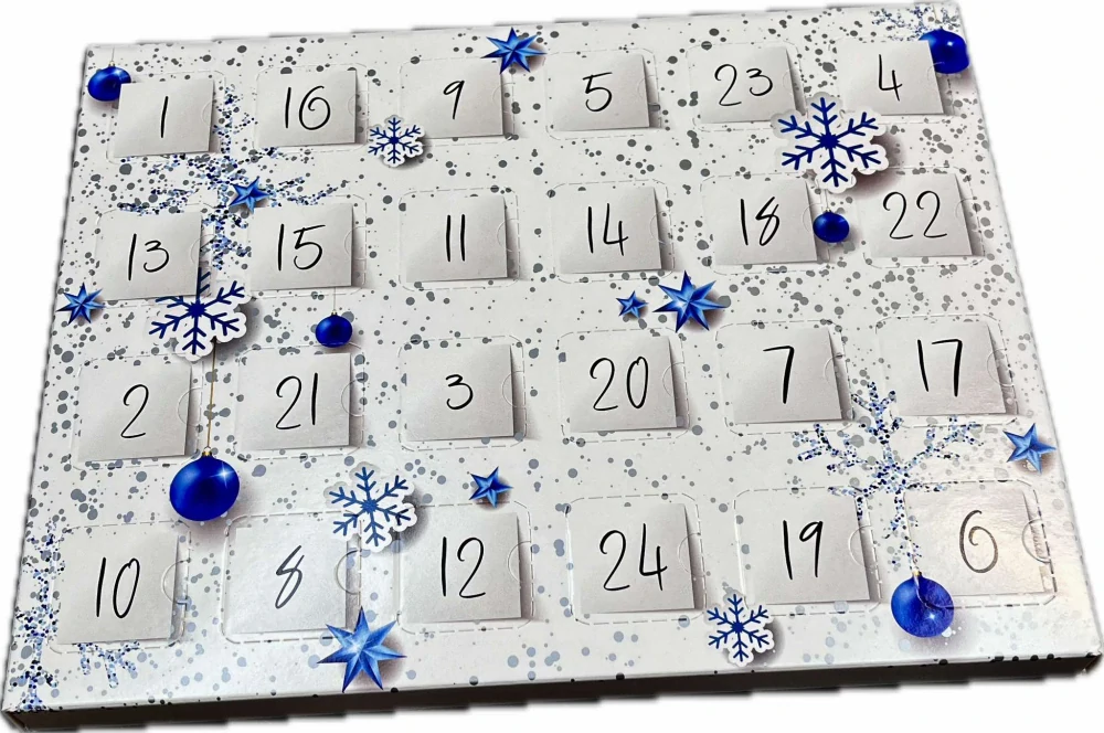 Adventní kalendář "Stříbrno-modrý" 28x28x2 cmSkladem 422 ks80 Kč/ ks66 Kč bez DPH
