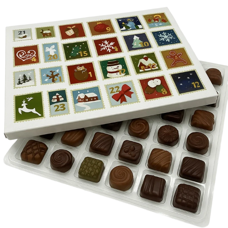 Veselý a barevně ilustrovaný adventní kalendář, který si můžete naplnit podle vlastní fantazie – pralinkami, mini perníčky, oříšky nebo jinými drobnými dobrotami.