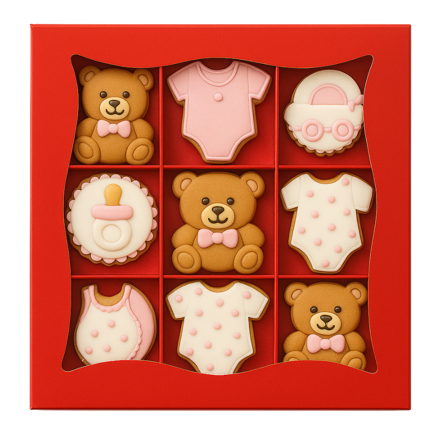 Elegantní lesklá dárková krabička o rozměrech 15 × 15 × 2 cm je ideální pro prezentaci perníčků, sušenek nebo jiných drobných dobrot.