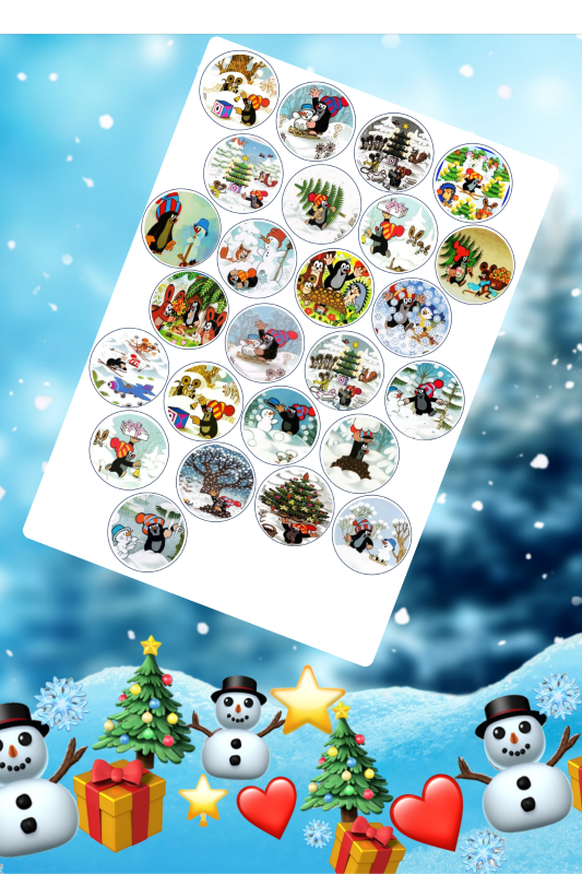 Fondánový list: Sada na adventní kalendář "Krteček o vánocích" kolečko 4 cm (kalendář 28x28x2) 25 ks/baldo 3 dnů170 Kč/ bal152 Kč bez DPH