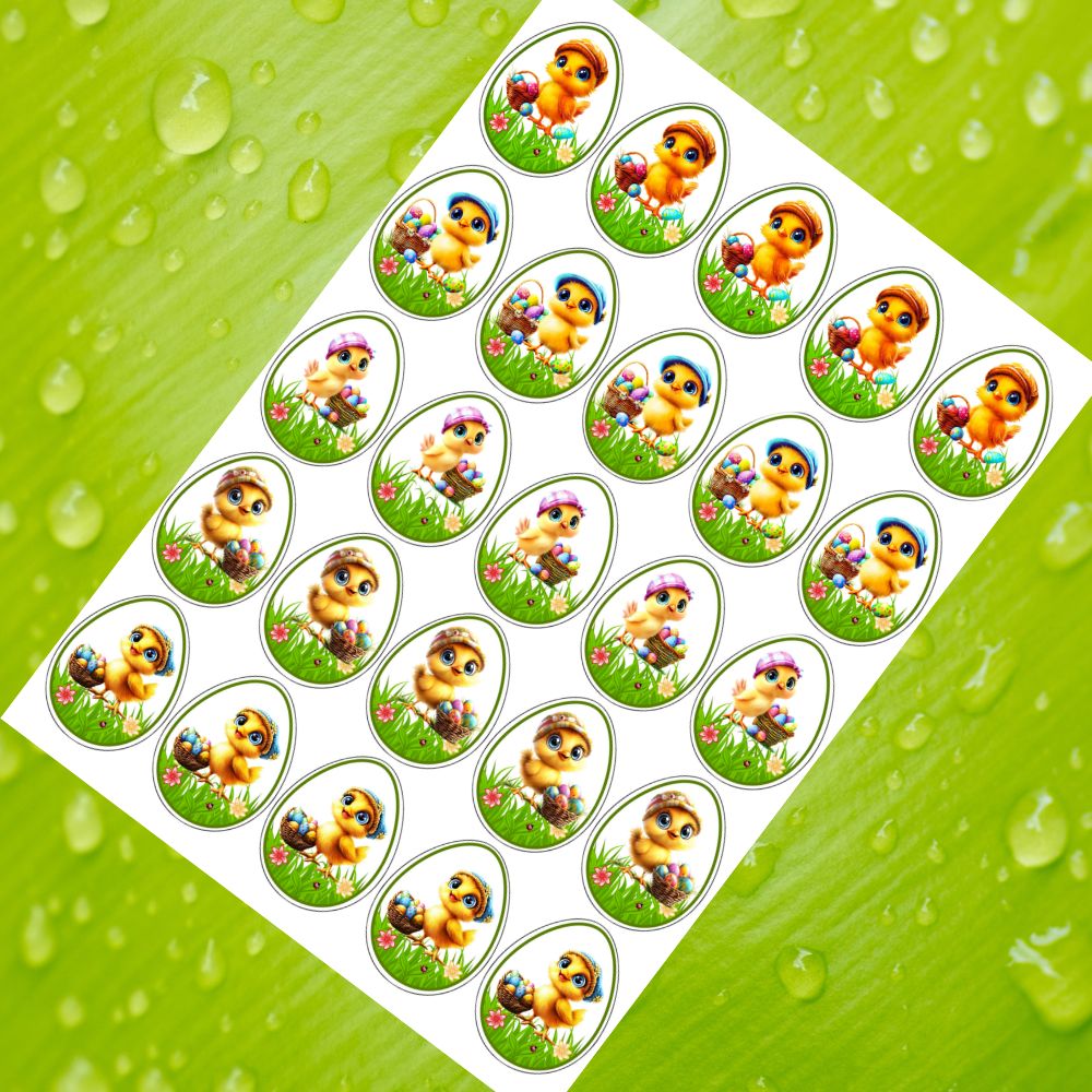 Kreslené kuřátko s košíčkem – jedlá dekorace, vajíčka 5 cm (25 ks)