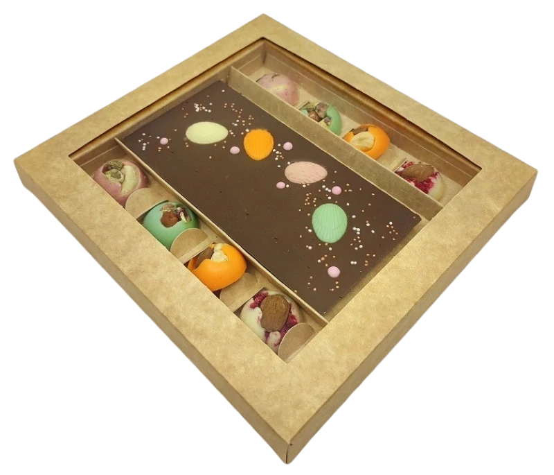 Elegantní bílá dárková krabička s průhledným víkem (přebalem), určená pro 8 kusů pralinek a jednu tabulku čokolády o rozměru 16 × 8 cm. Díky vnitřní mřížce lze pralinky a čokoládu bezpečně umístit do jedné krabičky.