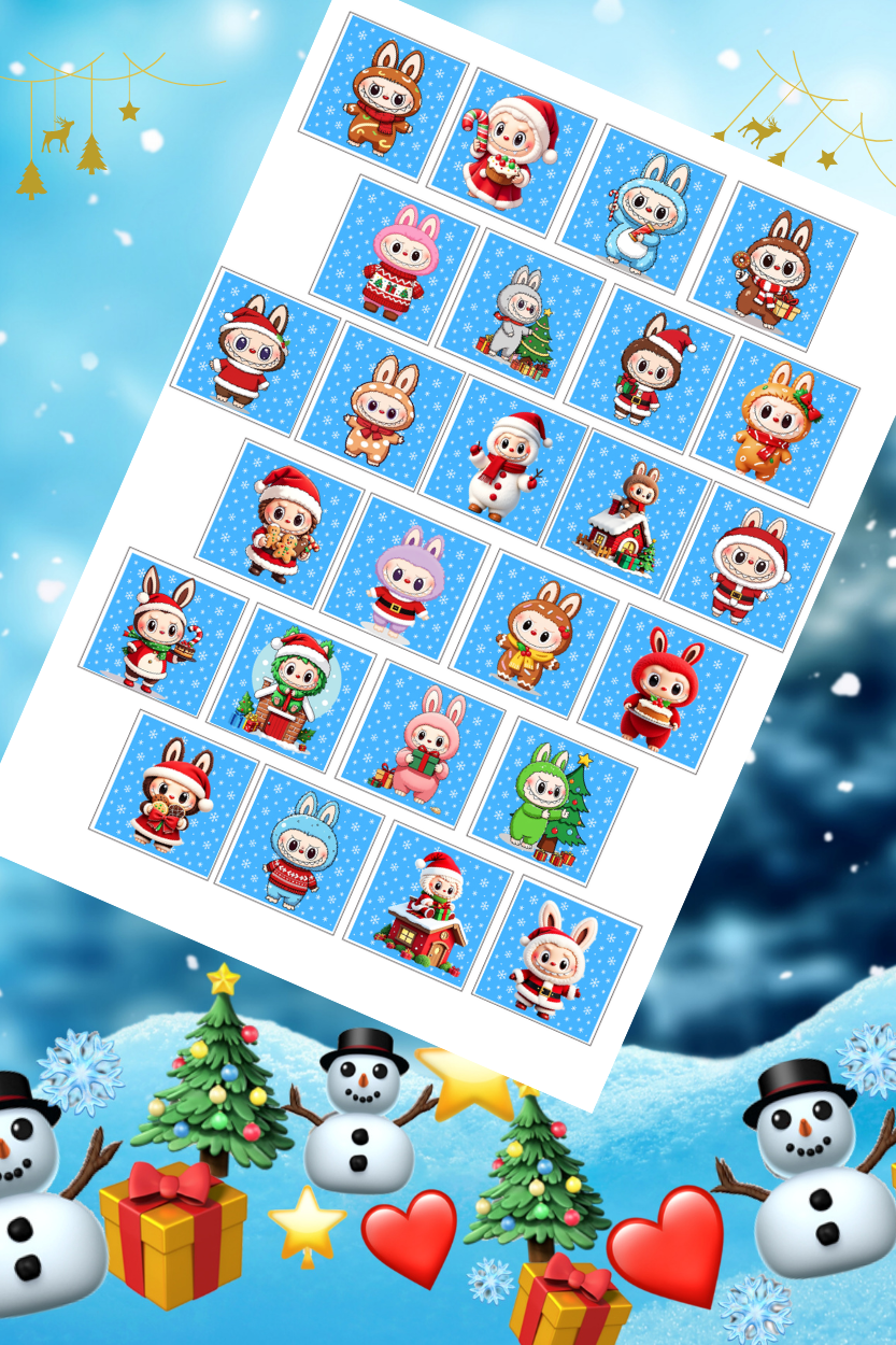 Postavičky Labubu v zimních a vánočních kostýmech na modrém pozadí přinesou vašemu adventnímu kalendáři jedinečný hravý styl. Sada obsahuje 25 jedlých čtverečků o velikosti 4×4 cm, které přesně pasují do políček kalendáře 28×28×2 cm. Fondánový list s výřezem zajistí snadnou manipulaci a nalepení.