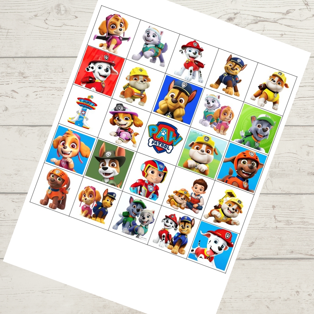 Jedlý tisk s motivy oblíbených psích hrdinů z Tlapkové patroly, určený k dekoraci perníčků, dezertů a tematických sad.