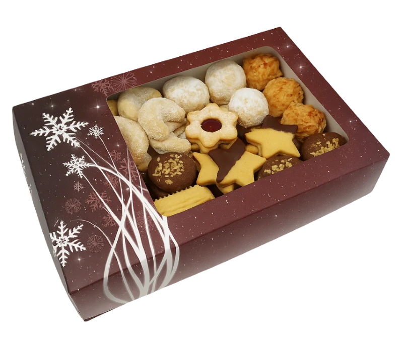 Vánoční krabička červená s průhledným okénkem 2 na 3/4 kg cukroví 25x15x5 cmskladem 94 ks25 Kč/ ks21 Kč bez DPH