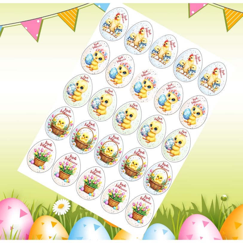 Jedlý tisk s veselými velikonočními motivy kreslených kuřátek, doplněných barevnými vajíčky, květinami a jemnými velikonočními prvky. Motivy jsou hravé, barevné a dobře čitelné, ideální pro velikonoční zdobení perníčků i dezertů.